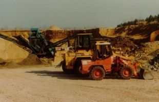 Das Rad des Fortschritts blieb in den 90er Jahren nicht stehen. Die erste Sandkuhle wurde eröffnet und in Betrieb genommen. Auf den Baustellen ging es auch richtig voran. Wie auf dem zweiten Bild zu sehen, mit einer mobilen Brechanlage zum Recyceln des vorhandenen Materials.