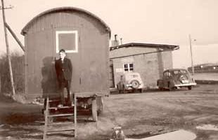 Ein Anhänger diente als Baubüro, Aufenthaltsraum und Lagerplatz für Kleingeräte wie Schaufeln und Schilder, die als Baustellensicherung, wie unten beim Autobahnbau zu sehen, dienten.